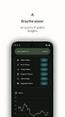 Niekada nepraleiskite audros su galingu Overmorrow gyvu orų radaru. Stebėkite audrų formavimąsi ir judėjimą realiuoju laiku, sekite kritulius – lietų, sniegą, šlapdribą ar krušą – savo vietovėje. Radaras taip pat numato būsimas audrų trajektorijas ir intensyvumą, suteikdamas jums galimybę būti vienu žingsniu priekyje. Intuityvi žemėlapio sąsaja daro orų stebėjimą paprastu ir efektyviu. Be to, rūpinkitės savo sveikata su integruotais oro kokybės ir žiedadulkių duomenimis. Overmorrow pateikia realaus laiko oro kokybės indeksą (AQI), nurodantį pagrindinius teršalus, bei detalią žiedadulkių ataskaitą (prieinamą Europoje), padedančią efektyviai valdyti alergijos simptomus, atsižvelgiant į medžių, žolių ir piktžolių žiedadulkių koncentraciją.